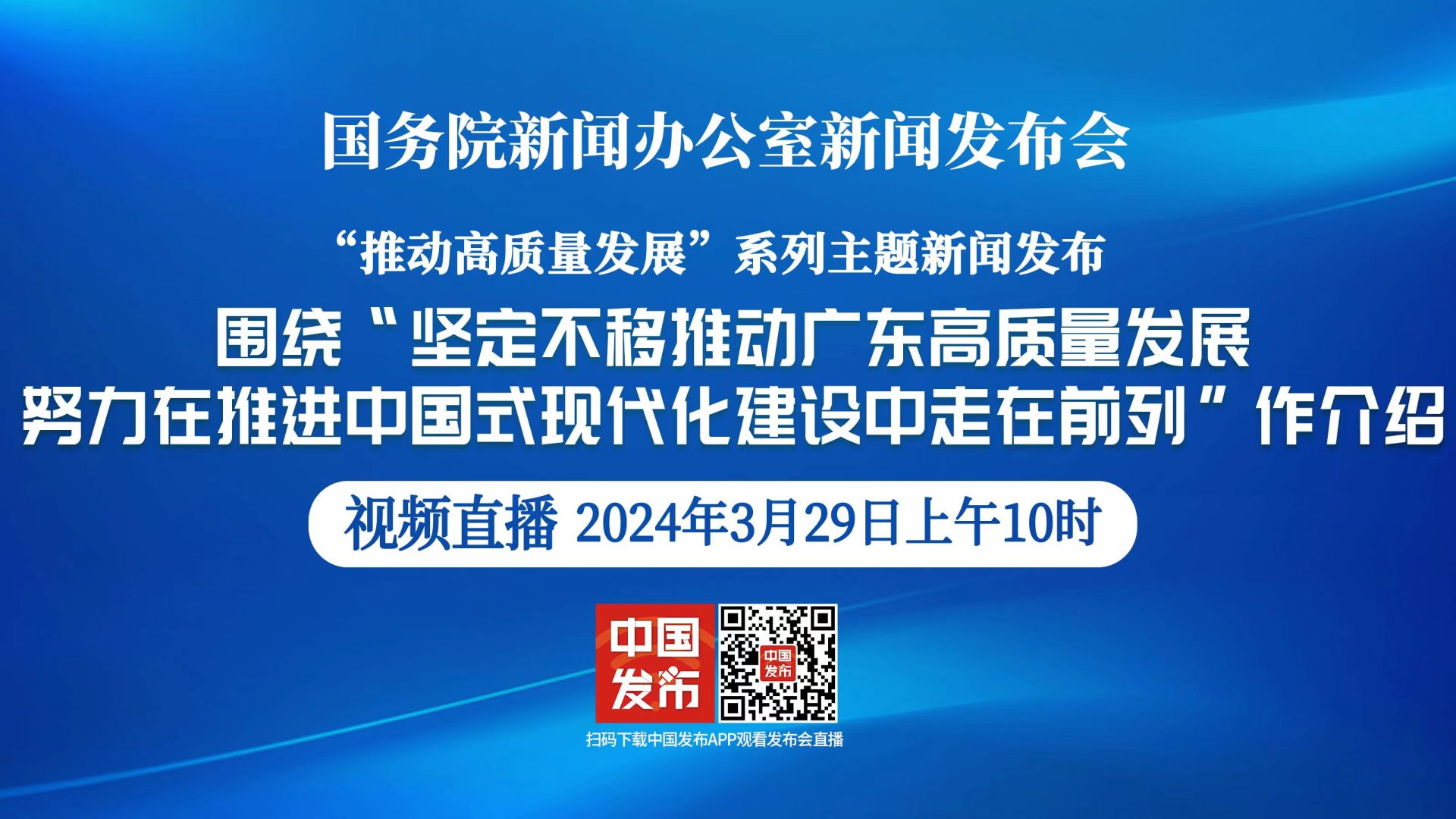 国务院新闻办公室于2024年3月29日(星期五)上午10时举行“推动高质量发展”系列主题新闻发布会,请广东省委副书记、省长王伟中围绕“坚定不移推动广东高质量发展 努力在推进中国式现代化建设中走在前列”作介绍,并答记者问。