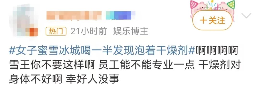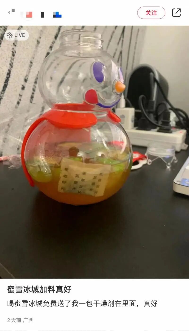 记者注意到,就在3月26日,有来自广西的消费者在社交媒体上发帖称,其在蜜雪冰城用雪王桶装着的饮品中喝出干燥剂。