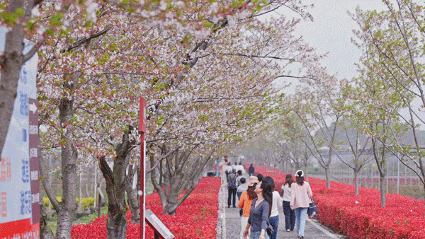 △除了郁金香,园区内还有其他春景可看,比如樱花。长约一公里的樱木花道有部分晚樱品种,花期可至4月上旬。
