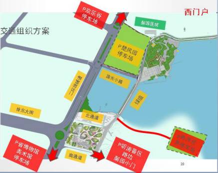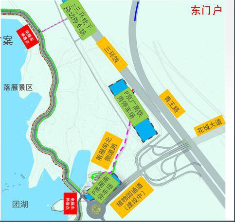 如停车场内没有停车位,建议游客通过欢乐大道、东湖通道、二环线分流到东门户——落雁景区。绿道沿线、景区内部可通过步行、自行车、景区电瓶车连通。