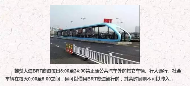 雄楚大道由于道路施工等原因,易出现拥堵的情况,请广大市民朋友尽量选择公共交通出行。如其他社会车辆在规定的时段内通行BRT,按照《道路交通安全法》和《湖北省实施<道路交通安全法>办法》的规定,罚款50元,不计分。