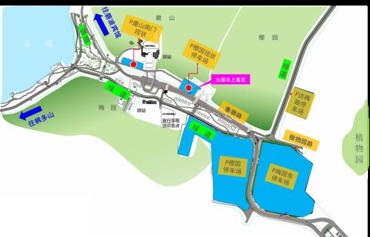 东湖高新方向来的车辆可通过鲁磨路、东湖通道、植物园路进入南门户停车场——樱园停车场、梅园东停车场。