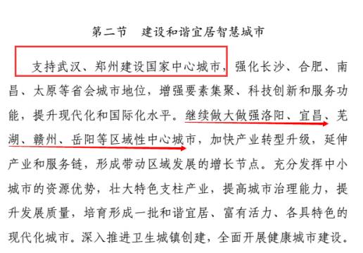 “支持武汉、郑州建设国家中心城市,强化长沙、合肥、南昌、太原等省会城市地位,增强要素集聚、科技创新和服务功能,提升现代化和国际化水平。继续做大做强洛阳、宜昌、芜湖、赣州、岳阳等区域性中心城市,加快产业转型升级,延伸产业和服务链,形成带动区域发展的增长节点。充分发挥中小城市的资源优势,壮大特色支柱产业,提高城市治理能力,提升发展质量,培育形成一批和谐宜居、富有活力、各具特色的现代化城市。深入推进卫生城镇创建,全面开展健康城市建设。