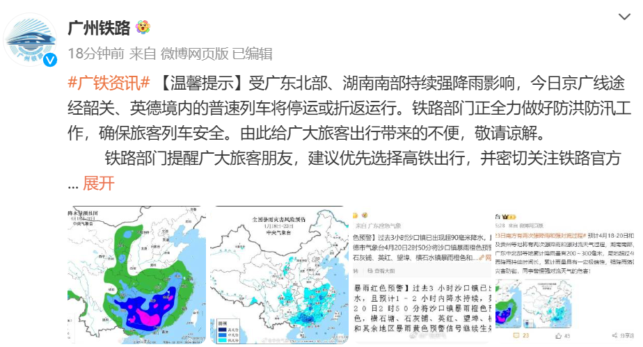 据@广州铁路微博9时消息,受广东北部、湖南南部持续强降雨影响,今日京广线途经韶关、英德境内的普速列车将停运或折返运行。铁路部门正全力做好防洪防汛工作,确保旅客列车安全。由此给广大旅客出行带来的不便,敬请谅解。