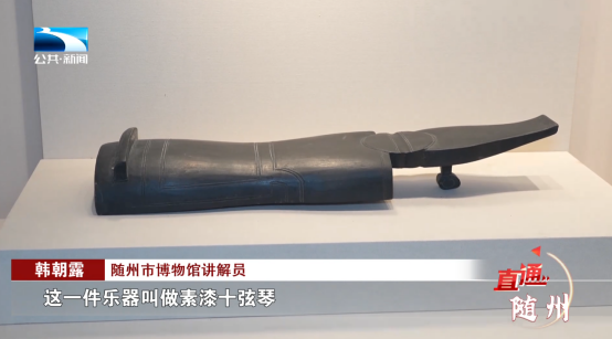 随州市博物馆讲解员 韩朝露:“在演奏它的时候,我们用图上这种小木棒从上往下来敲击它的横截面,发出的声音非常清脆悦耳。编磬,它通常是与编钟合奏的,被称为金石之音。这一件乐器叫做素漆十弦琴,由十根弦组合而成,出土的时候这一些琴弦已经腐烂了;这一件素漆十弦琴,在此前的考古发现中未见记载,考古文献中也没有发现它的身影,说明它应该是曾侯乙的独家定制款。”