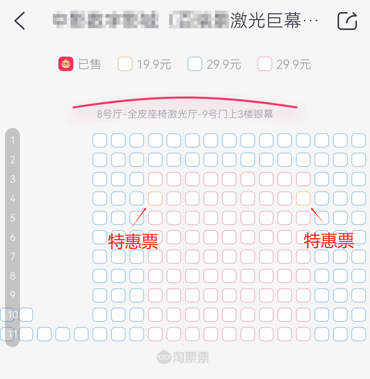 某电影院5月24日22:05放映的《九龙城寨之围城》,其座椅区域通过颜色区分为橙色区19.9元、红色区29.9元、蓝色区29.9元,在第4排4座和4排12座的位置,分别设置了2个特惠座位,这两个座位的橙色与29.9元的红色在色彩上非常接近,肉眼几乎难以辨别。
