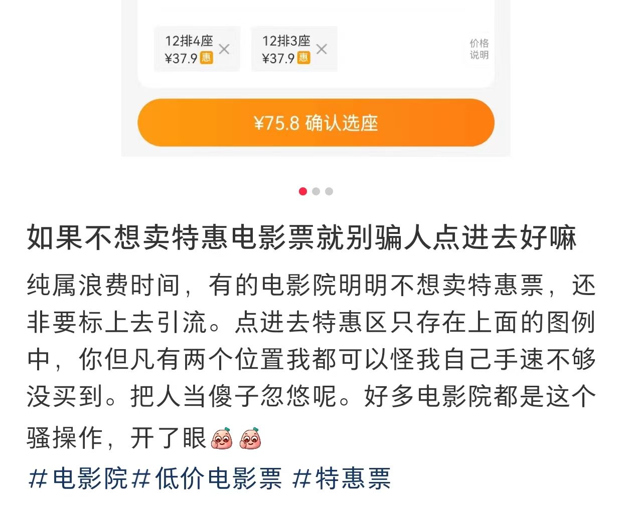 “和朋友约好了这场电影的时间,只看到很便宜的价格提示,没进去看具体票价,不好爽约,只能吃个闷亏。”