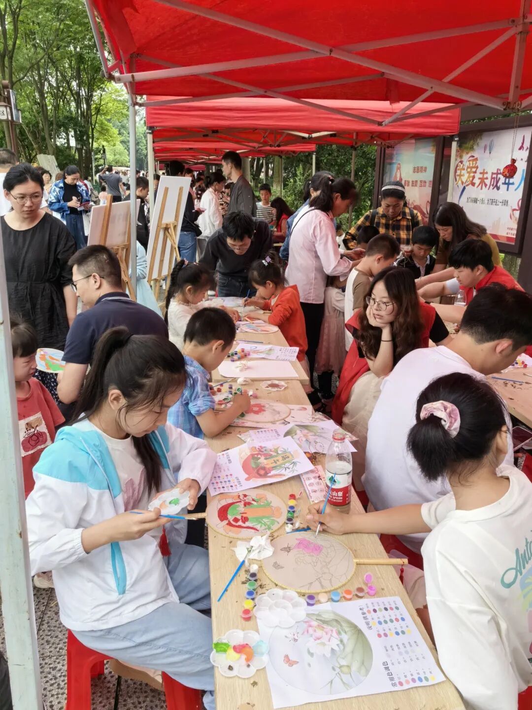 心理活动区艾香浓浓,一群群孩子和家长一起端坐桌前DIY端午香包;还有孩子在爸爸妈妈的帮助下,在纯白的扇面上绘制出温馨的画面。