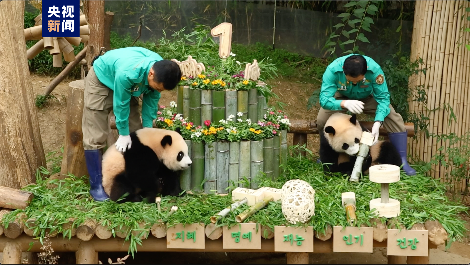 据央视新闻消息,当地时间7日,旅韩大熊猫“乐宝”和“爱宝”的双胞胎女儿“睿宝”和“辉宝”迎来一周岁生日。当天,爱宝乐园举办了周岁生日会以及“抓周”仪式,为它们庆祝第一个生日。