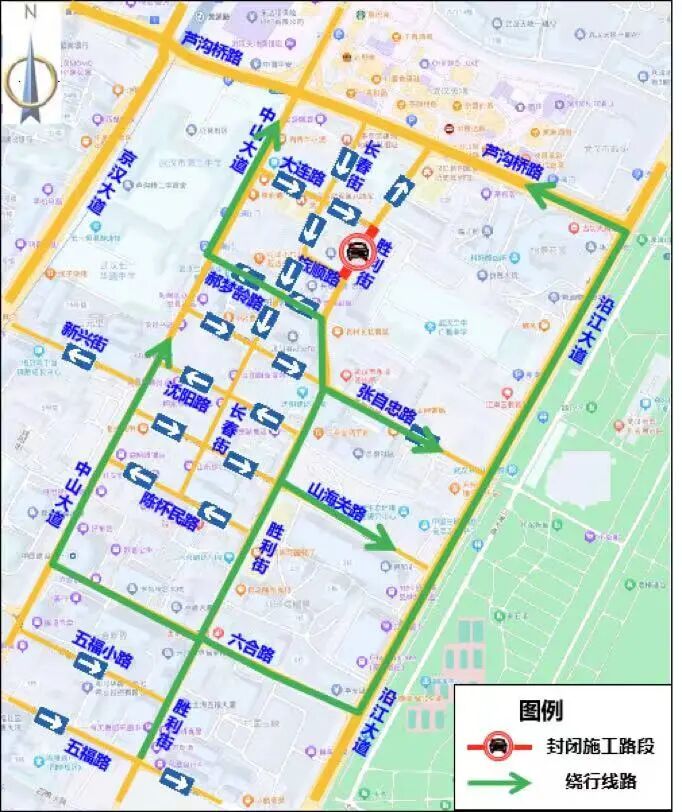 2.需通行施工路段的机动车可绕行六合路、郝梦龄路、中山大道、沿江大道等周边道路。