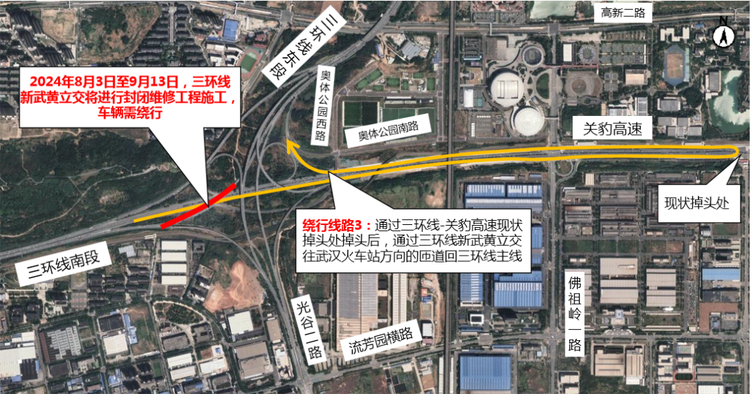 绕行路线3(中型及以上货车建议绕行该路线):通过三环线-关豹高速现状掉头处掉头后,通过三环线新武黄立交往武汉火车站方向的匝道回三环线主线。