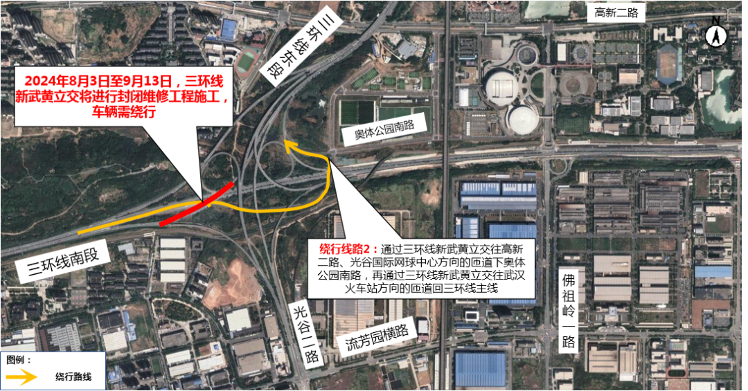 绕行路线2:通过三环线新武黄立交往高新二路、光谷国际网球中心方向的匝道下奥体公园南路,再通过三环线新武黄立交往武汉火车站方向的匝道回三环线主线。