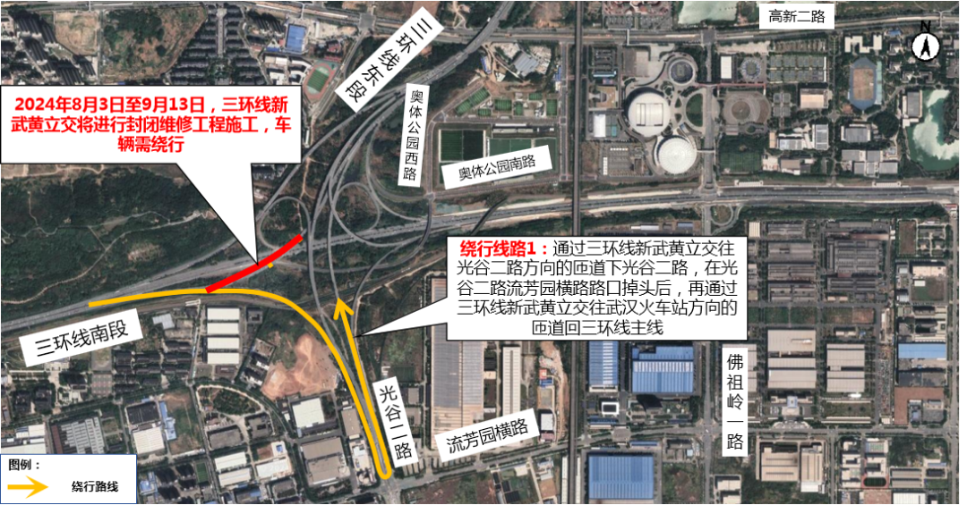 绕行路线1:通过三环线新武黄立交往光谷二路方向的匝道下光谷二路,在光谷二路流芳园横路路口掉头后,再通过三环线新武黄立交往武汉火车站方向的匝道回三环线主线。
