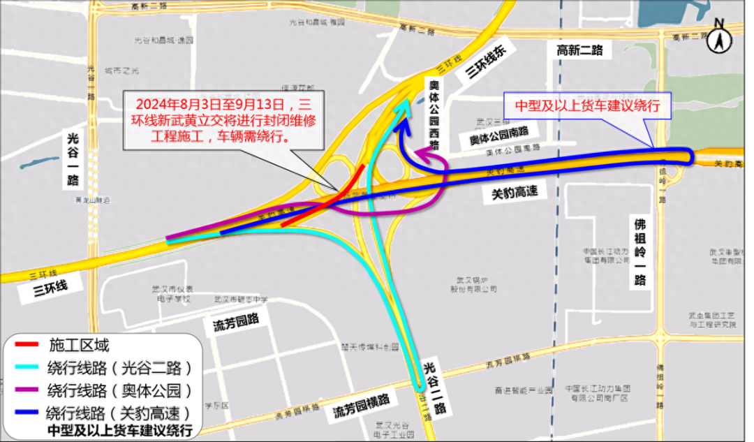 施工期间三环线新武黄立交外环主线(D匝道)禁止机动车通行,原由西向东经过三环线新武黄立交外环主线(三环线南段往武汉火车站方向)施工路段的车辆,可通过光谷二路、奥体公园南路、关豹高速等周边道路绕行。