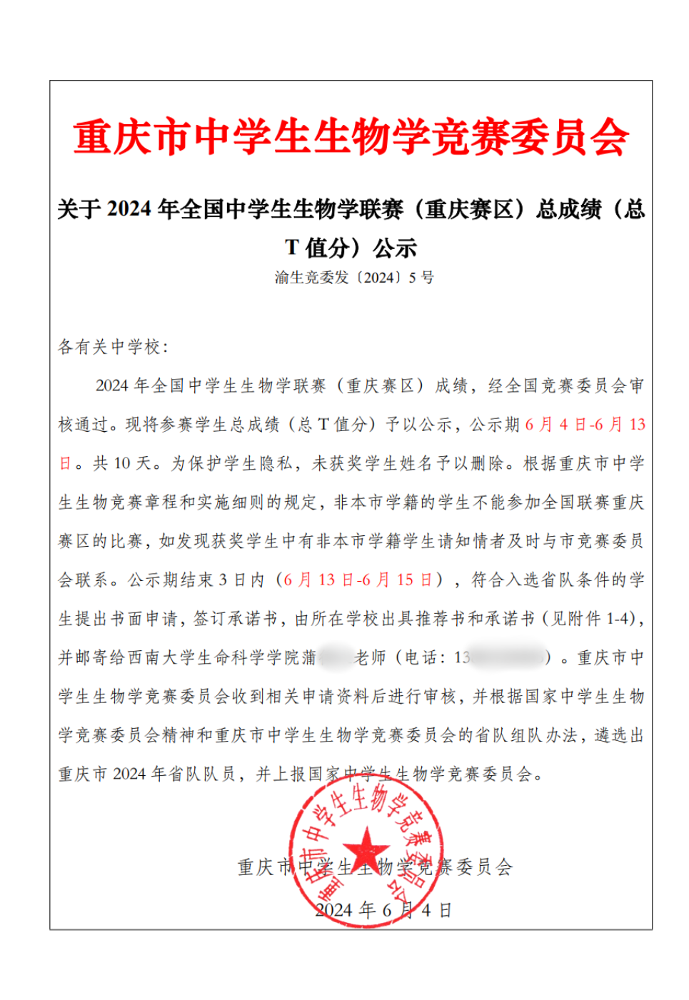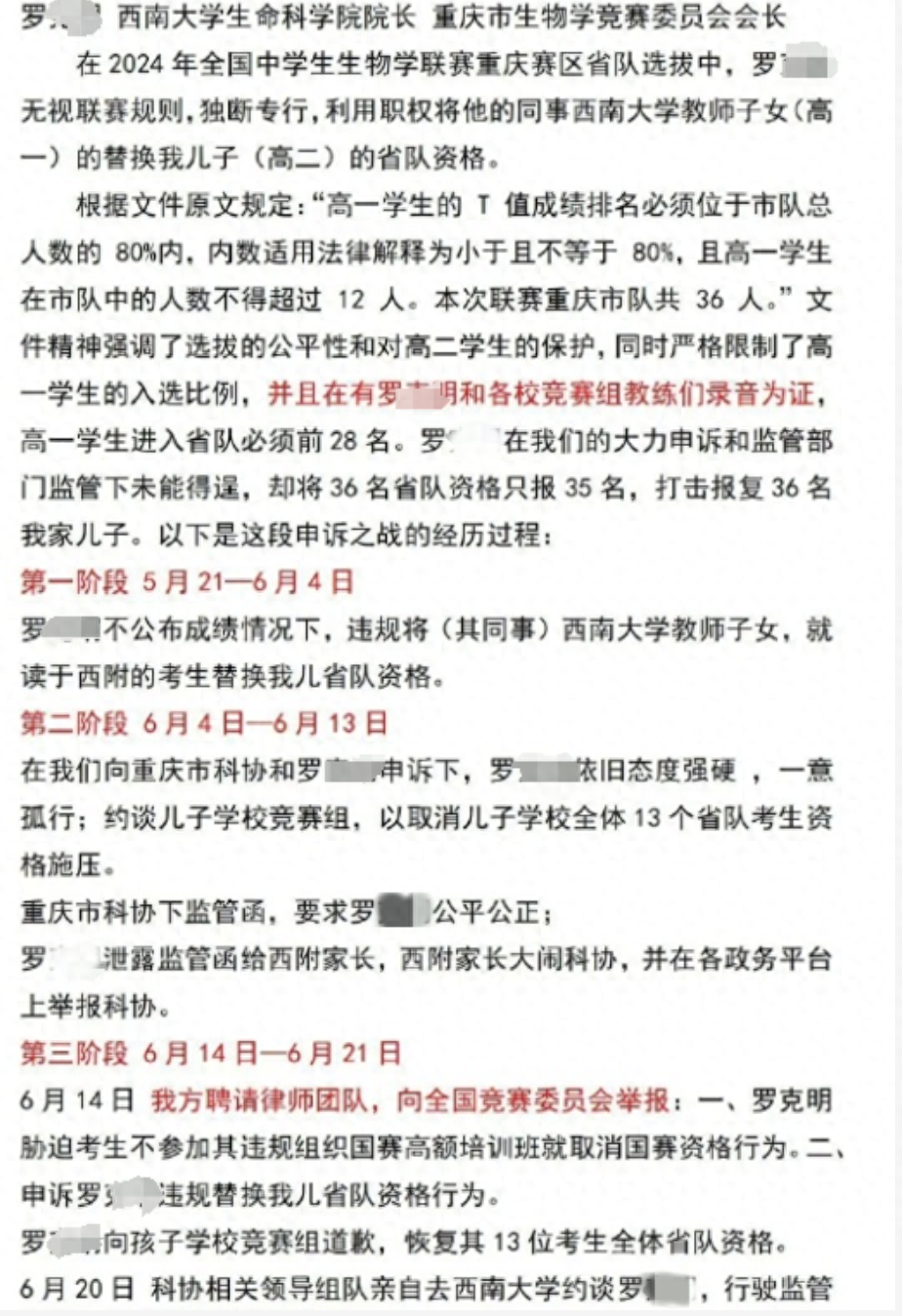 近日,有网友通过网络平台发帖投诉重庆市生物学竞赛委员会会长罗某,在2024年全国中学生生物学联赛重庆赛区省队选拔过程中,违规用同事子女替换其孩子参赛名额,引关注。