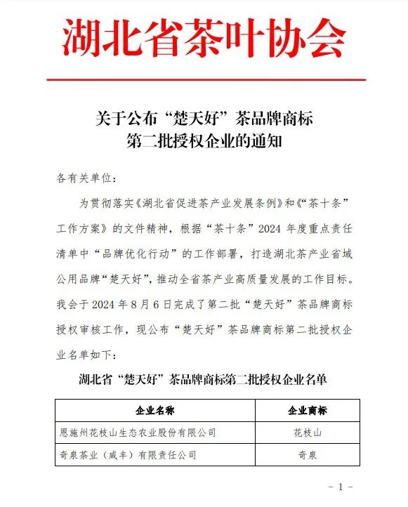 为贯彻落实《湖北省促进茶产业发展条例》和《省委农办关于实施十大行动推动茶产业高质量发展的意见》的文件精神,按照“茶十条”2024 年度重点责任清单中“品牌优化行动”的工作部署,根据《关于<湖北省“楚天好”茶品牌管理办法>(试行)发布的通知》(鄂茶协﹝2024﹞12号),湖北省茶叶协会采取授权认定方式,已于2024年8月6日完成了第二批“楚天好”茶品牌商标授权工作。