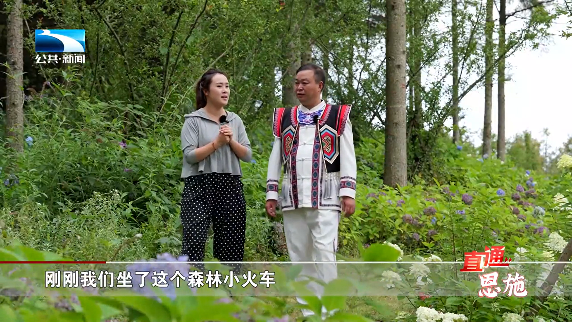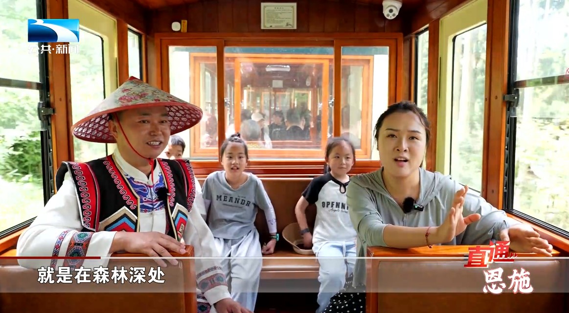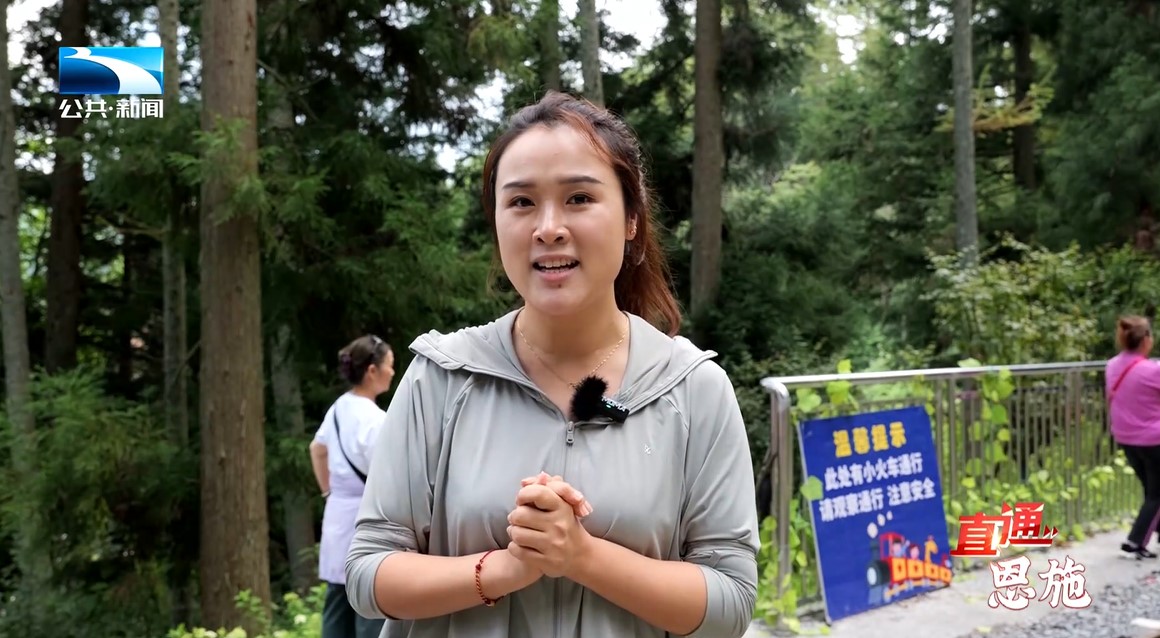 记者 田莉:“为了让我们的游客更加深入地领略、 感受到长岭岗的慢节奏、慢生活,那从去年开始长岭岗就在森林的深处,打造了这样一辆梦幻且可爱的森林小火车。那今天我们就邀请‘土家歌王’张世平带我们一起感受一下。”