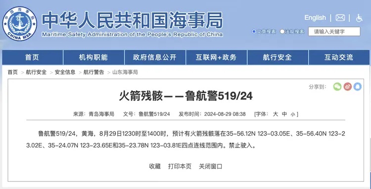 据中国海事局网站消息,青岛海事局发布航行警告,8月29日12时30分至14时,黄海部分海域预计有火箭残骸掉落,禁止驶入。
