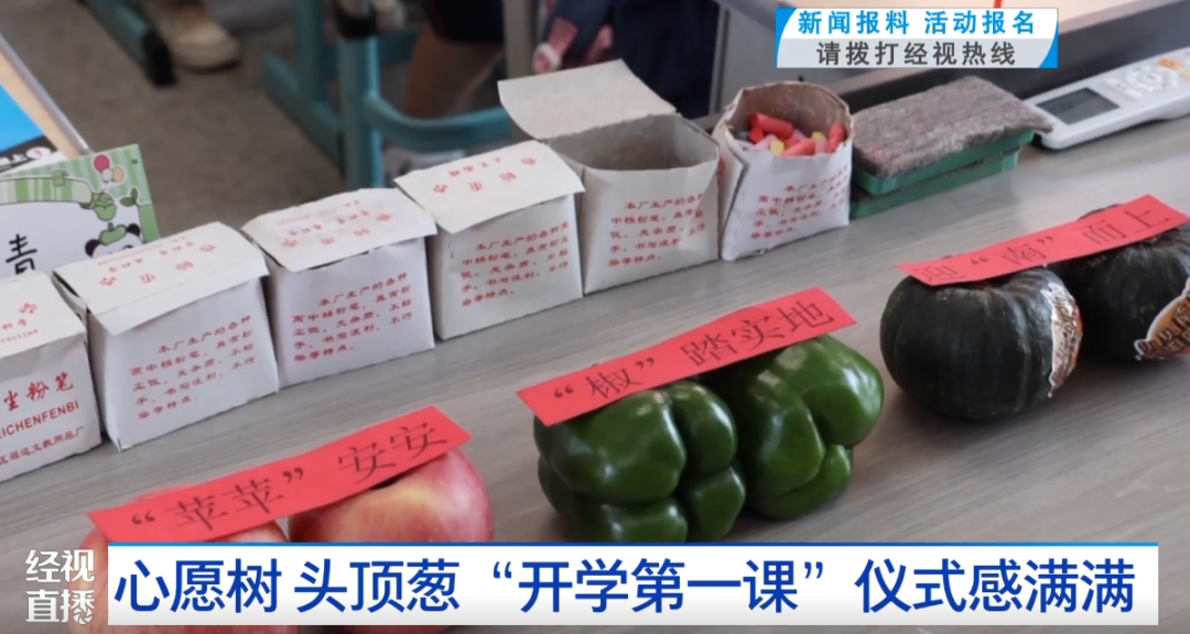 值得一提的是,为了拉满开学仪式感,班主任袁琴在讲台上还放置了寓意“平平安安”“突飞猛进”“心想事成”等美好祝愿的苹果、南瓜、橙子等物,在教室门口还系上了一把小葱,学生头顶葱进入教室,寓意着“聪明绝顶”。