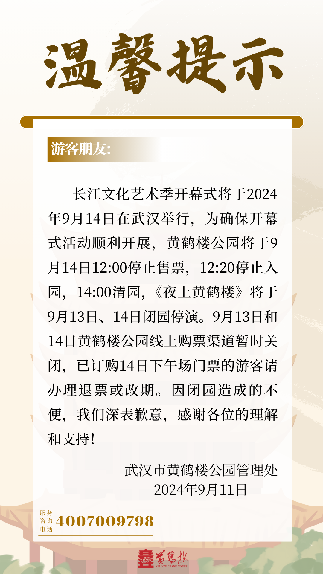 武汉长江文化艺术季开幕式将于2024年9月14日晚在武汉举办,黄鹤楼公园、晴川阁、武汉大禹文化博物馆、龟山公园、知音号等发布临时关闭、停演、闭馆公告。详情如下。