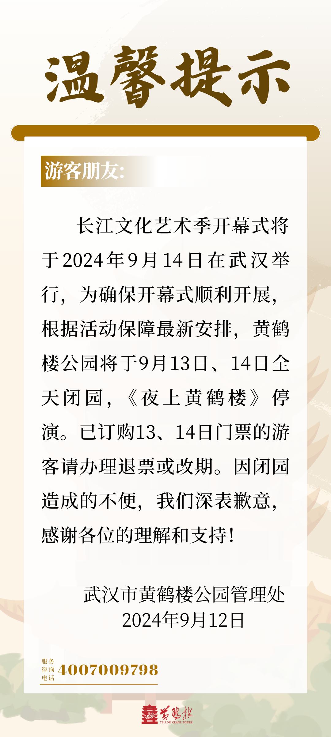 今天,长江云新闻从黄鹤楼公园微信号获悉,长江文化艺术季开幕式将于2024年9月14日在武汉举行,为确保开幕式顺利开展,黄鹤楼公园将于9月13日、14日全天闭园,《夜上黄鹤楼》停演。已订购13、14日门票的游客请办理退票或改期。