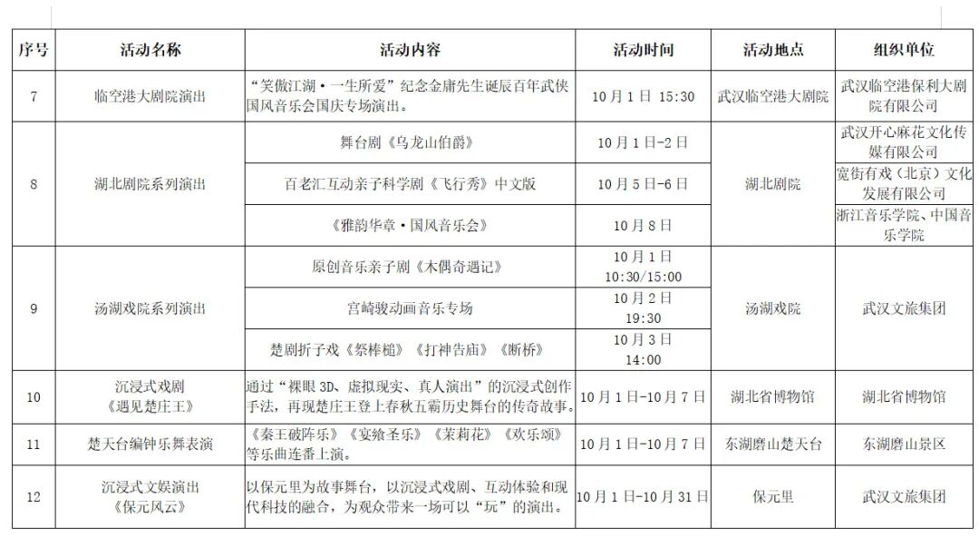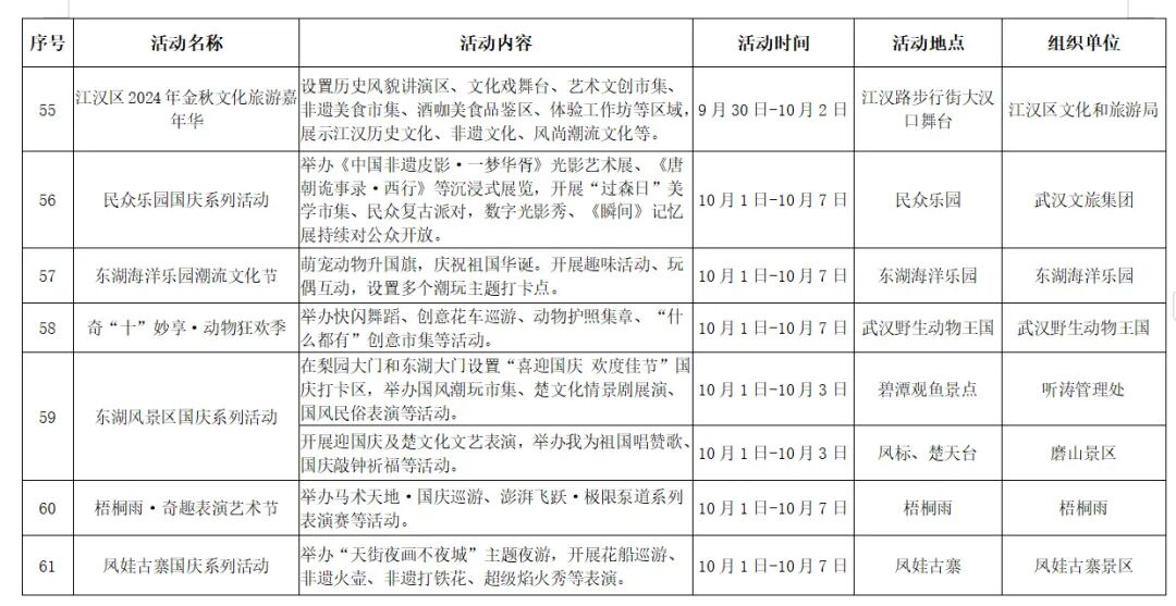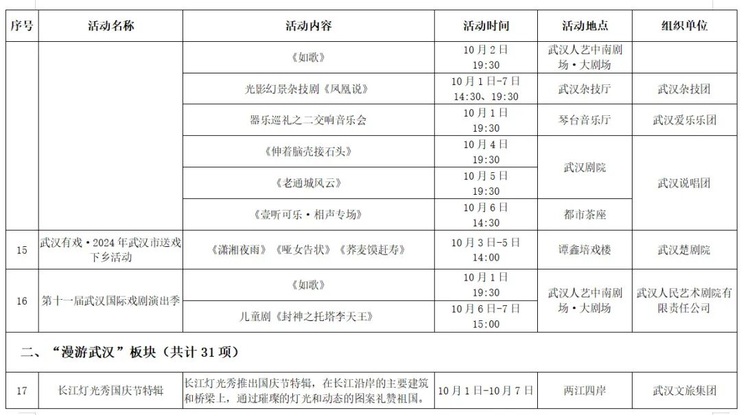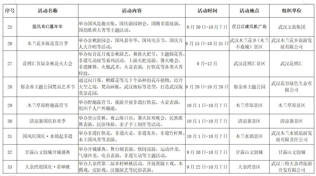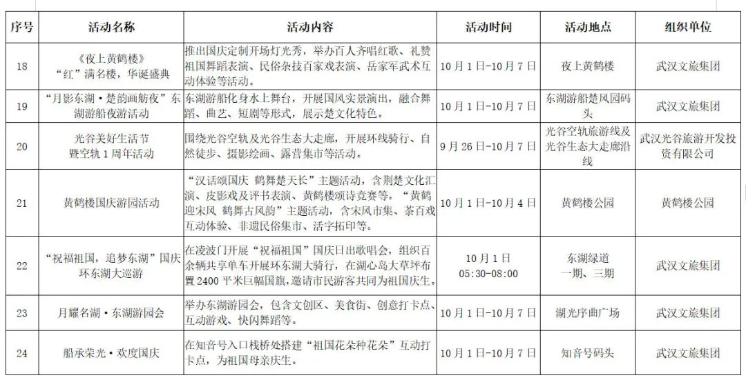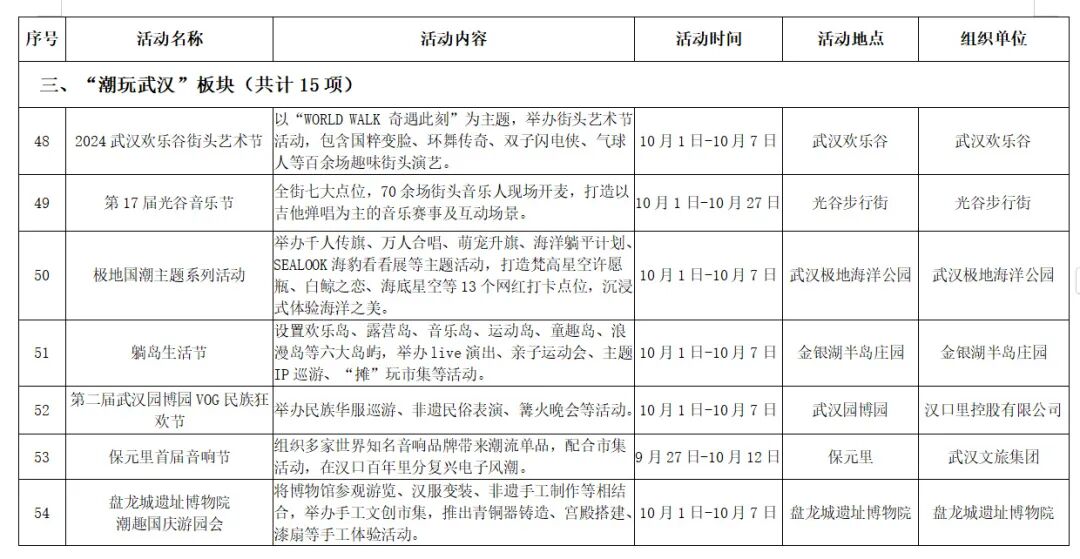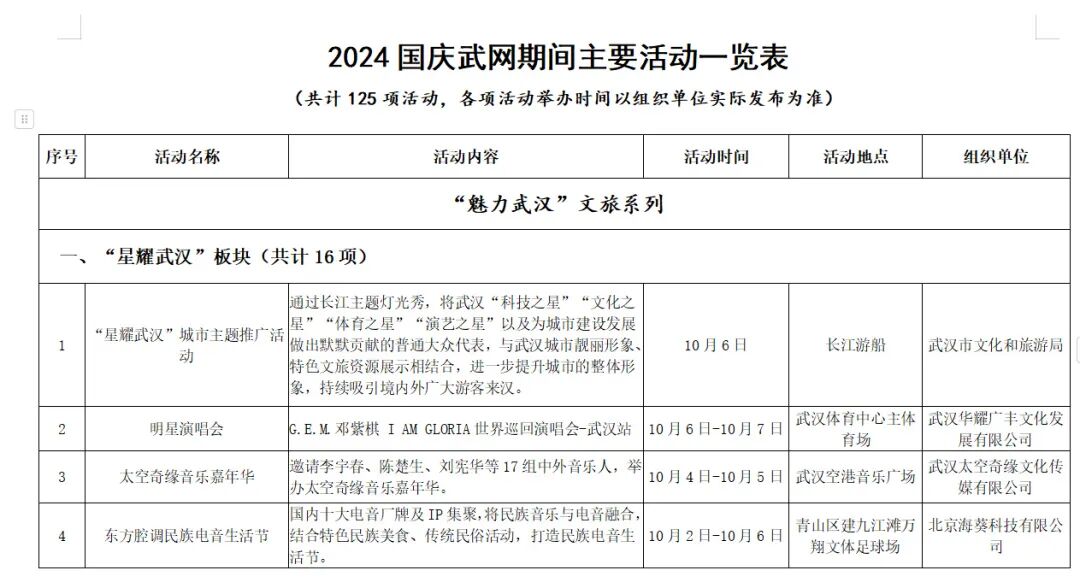 会上介绍,今年国庆假期,武汉市以“畅游动感武汉 共度欢乐时光”为主题,整合“文、旅、体、商、演”全域要素,推出“魅力武汉”文旅系列、“乐购武汉”消费系列、“活力武汉”体育系列,共计125项活动。