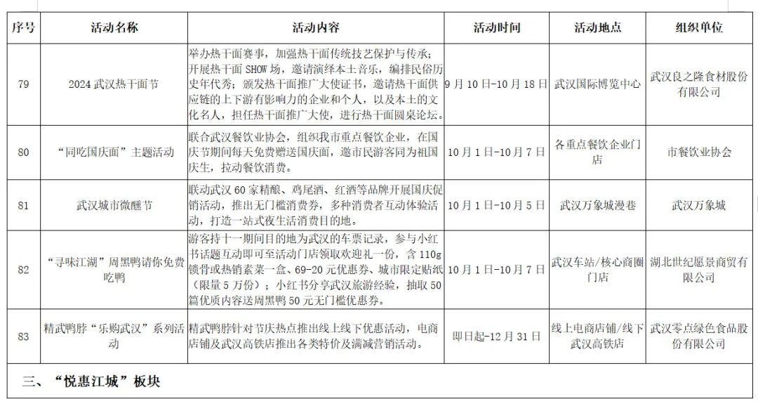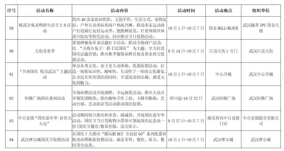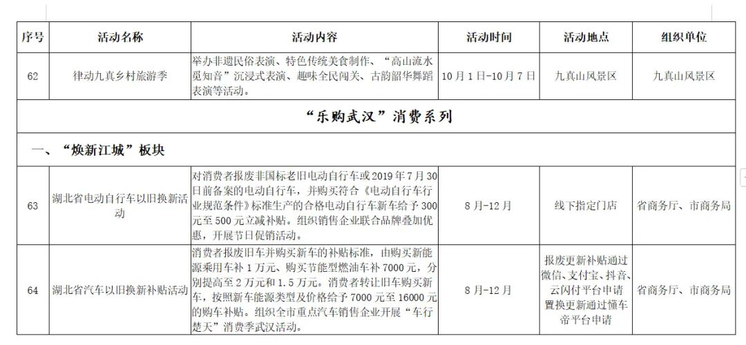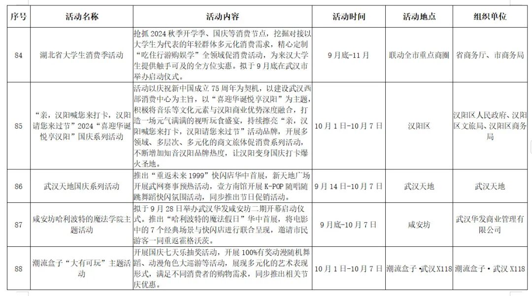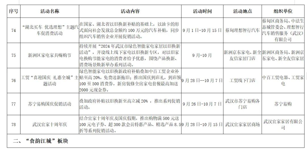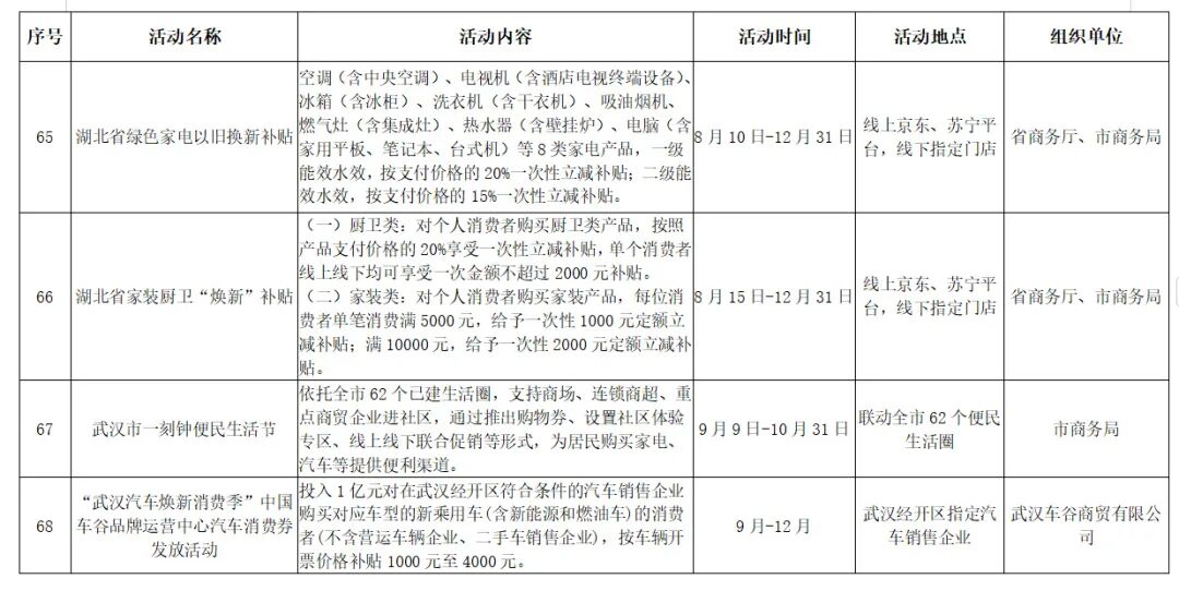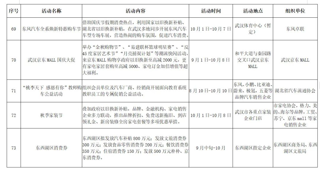 包括继续加力实施消费品以旧换新政策,推动以旧换新惠民服务进社区;举办“武汉汽车焕新消费季”,投入亿元汽车消费券支持新车购置;在新洲区举办家电家具嗨购节;支持办好第29届武汉家博会、秋季家装节等;继续开展武汉“十大名菜 十大名点”餐厅评选活动,挖掘并推广特色餐厅;举办湖北大学生消费季活动;开展国货潮品老字号嘉年华活动,推出“国庆定制”产品;组织销售企业联合直播电商平台开展直播促销活动,“供销荆选”平台开设特色专区,饿了么、美团等电商平台投入超千万元消费补贴。