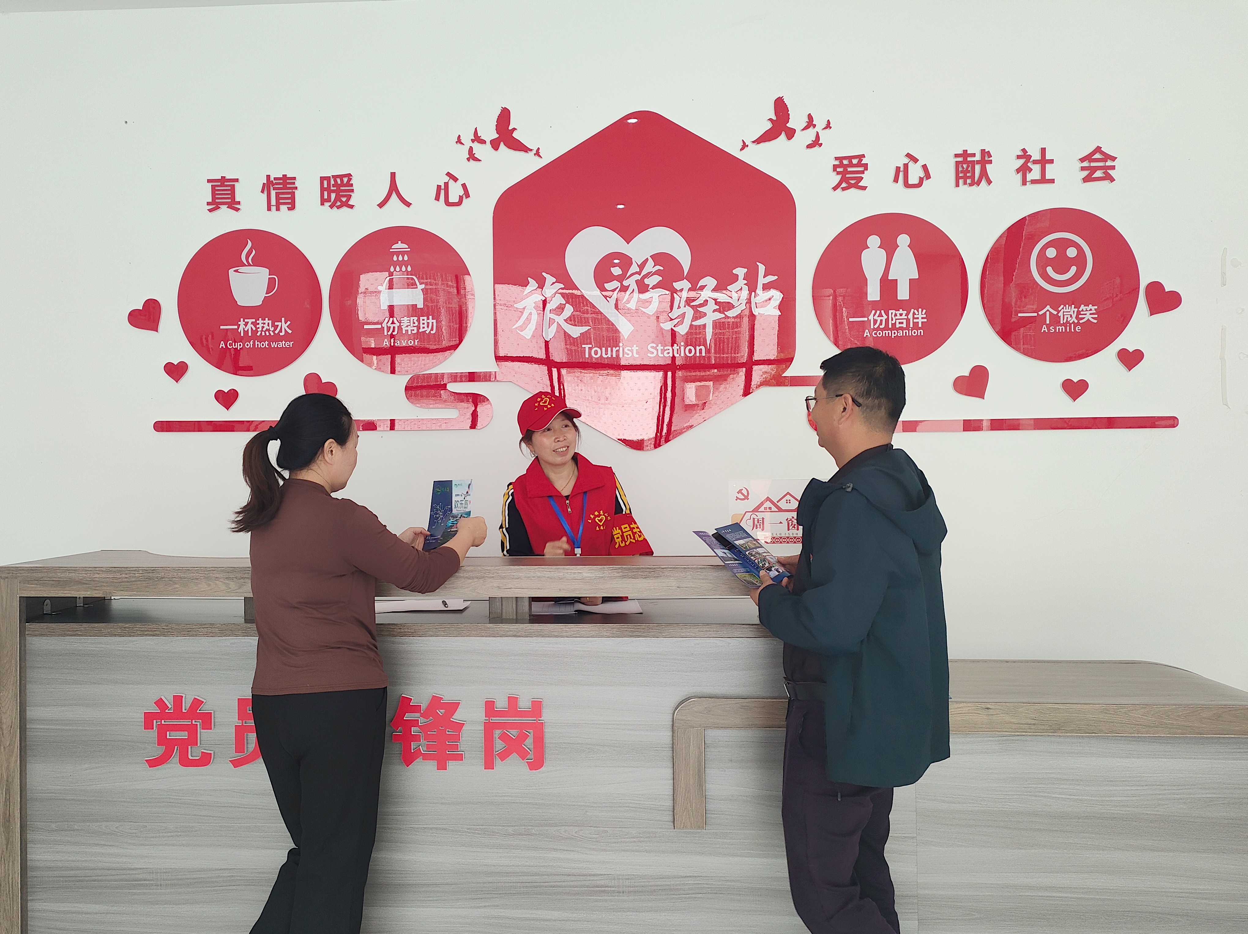 “欢乐岛景区有蹦极、皮划艇、直升机等游玩项目,还推出了海陆空联动新玩法呢!”在高山村旅游驿站,党员志愿者正在为游客做景点项目介绍。环顾四周,驿站内沙发、桌椅、充电插座、饮水机、急救药箱等设施一应俱全,并配有党员群众志愿者轮流值班,贴心为旅客、周边群众、快递员、执勤交警、环卫工人等提供饮水、如厕、休息、手机充电、旅游咨询等志愿服务。