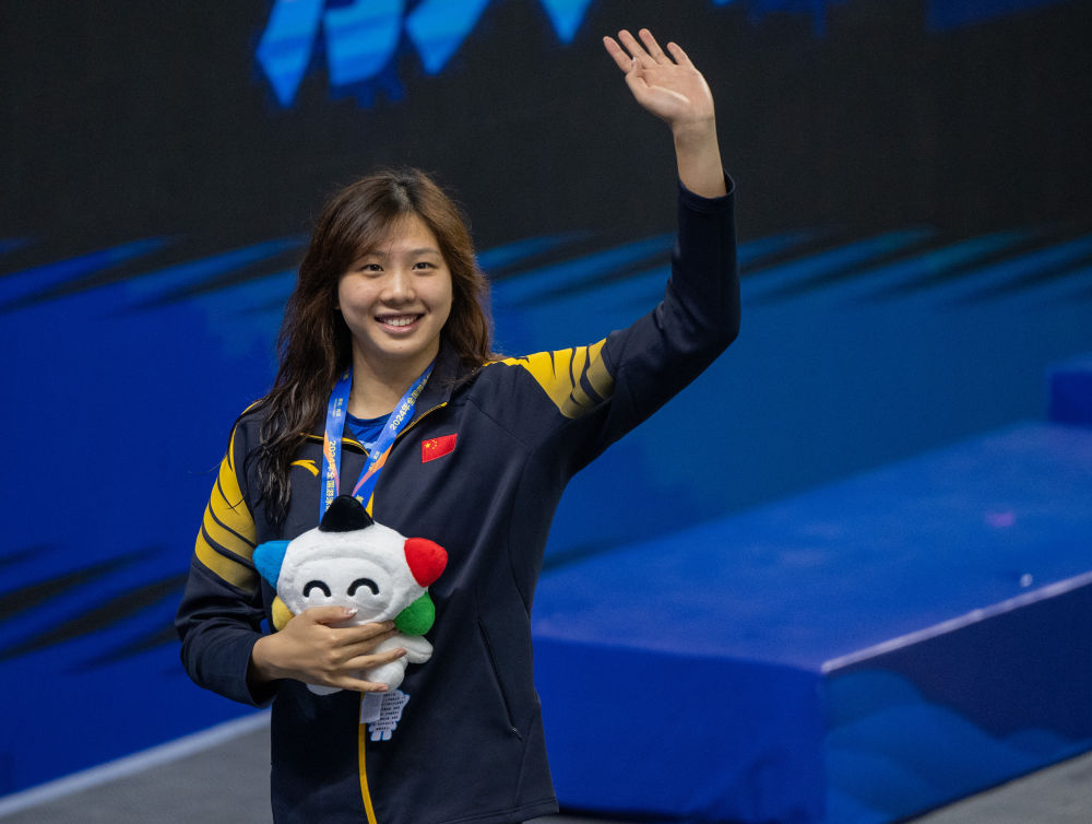 9月26日,唐钱婷在颁奖仪式后向观众挥手致意。新华社记者 胡竞文 摄