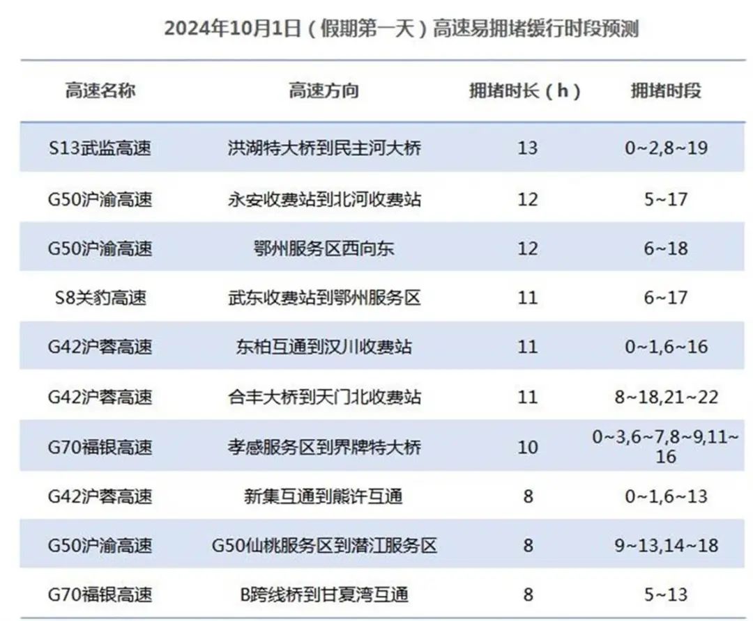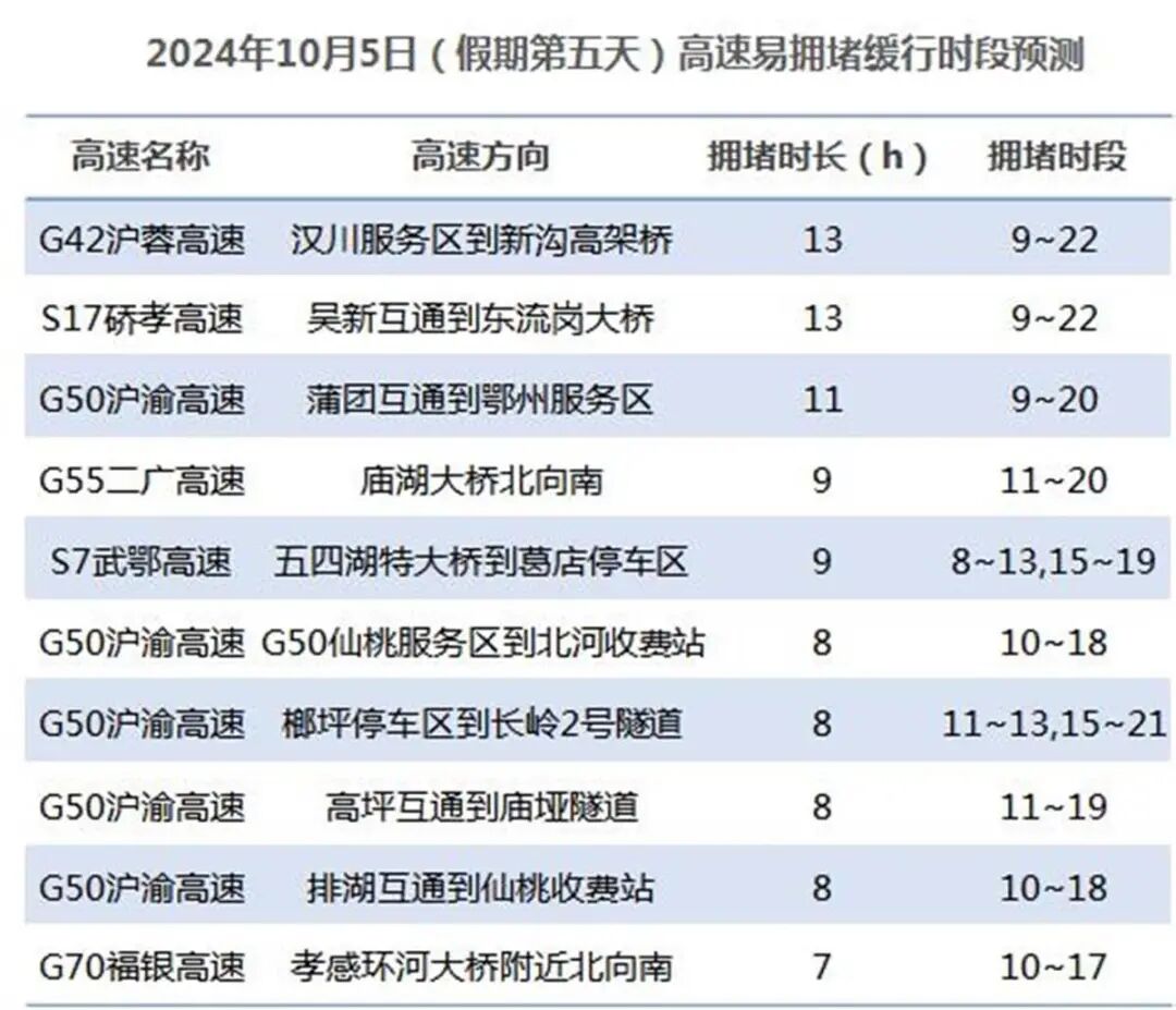 据了解,由于国庆假期时间较长,不少驾驶员跨省长途出行,节日后期选择提前一两天返程,形成10月6日、10月5日的返程车流最为集中。另外,不少驾驶员偏好在傍晚前后到达返程目的地,在选择出行时间时,导致下午时段的高速公路最拥堵。如果驾驶员选择从以上返程易拥堵的高速公路通行,建议错开高峰时段,比如在9时之前或者22时之后经过易堵路段。