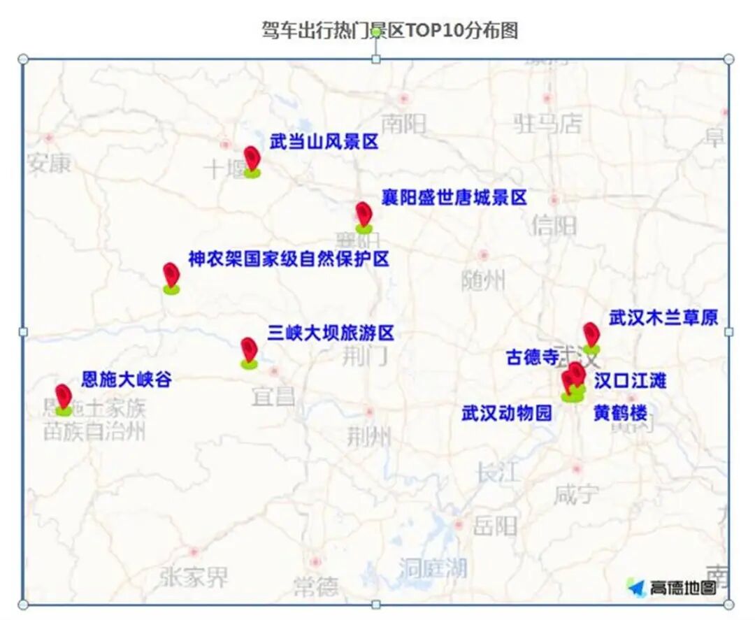 高德地图预测,国庆假期,武汉黄鹤楼景区出行热度最高,其次是三峡大坝旅游区、恩施大峡谷、武当山风景区、襄阳盛世唐城景区、古德寺、武汉动物园、武汉木兰草原、神农架国家级自然保护区、汉口江滩等。