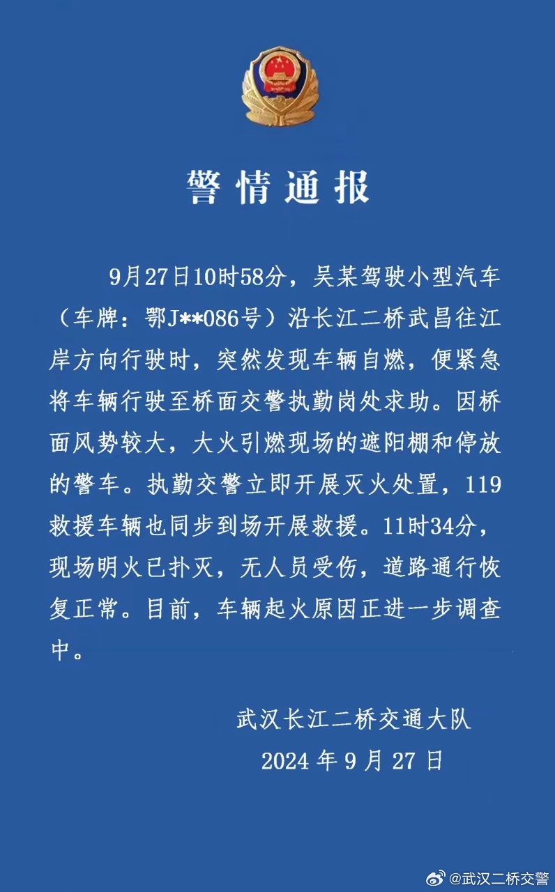 9月27日,武汉市公安局交通管理局武汉长江二桥大队官方微博“武汉二桥交警”发布警情通报↓↓