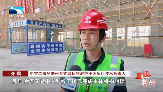 中交二航局荆州多式联运物流产业园项目技术负责人 齐鹏:“目前,物流交易中心候工楼已完成主体机构封顶,后续继续开展里面的二构施工以及装饰装修施工,预计在2025年年底第一(期)的建设基本完成。”