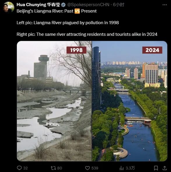 1998年,北京亮马河饱受污染困扰,河水枯竭。