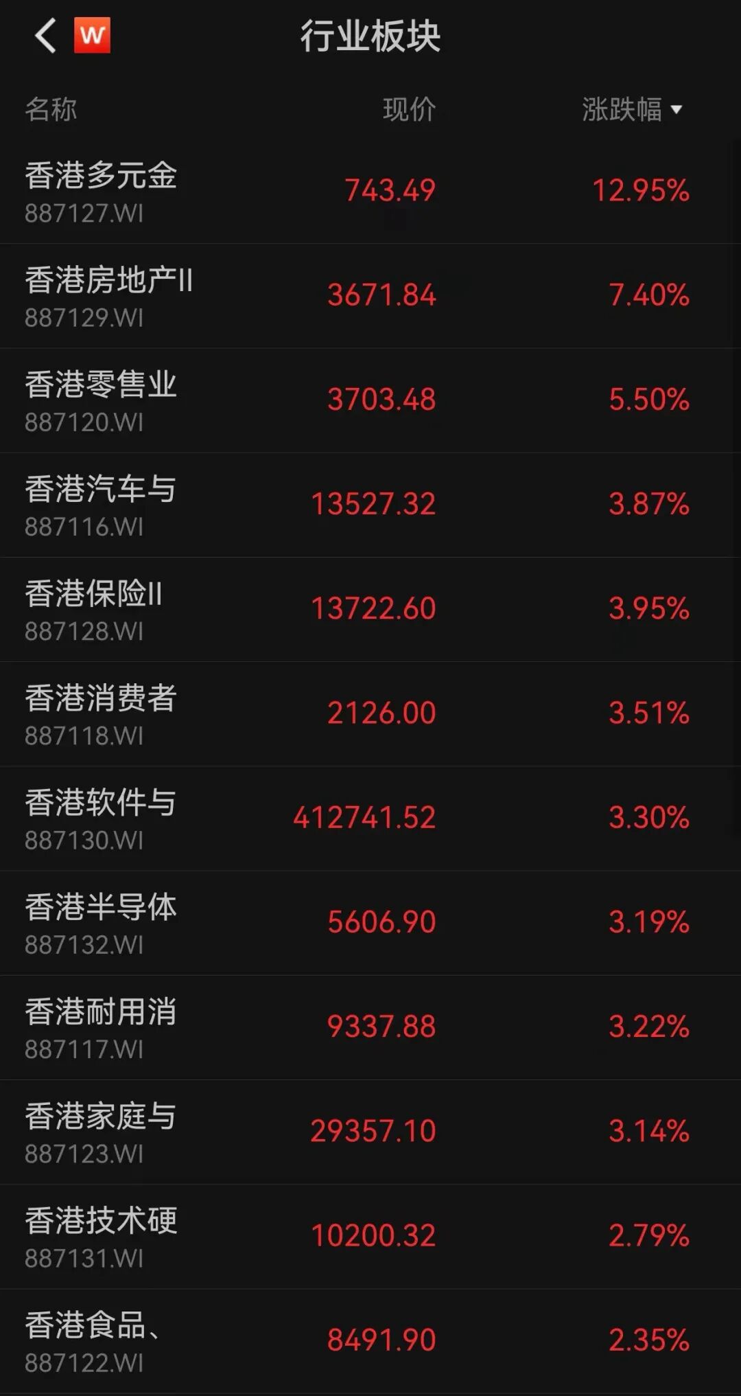 从行业板块看,多元金融板块表现一骑绝尘领涨全市场,截至10点累计涨幅接近13%,中国金融投资管理暴涨超350%,华融金控大涨超200%、申万宏源香港、第一上海等个股也迎来强劲上涨。