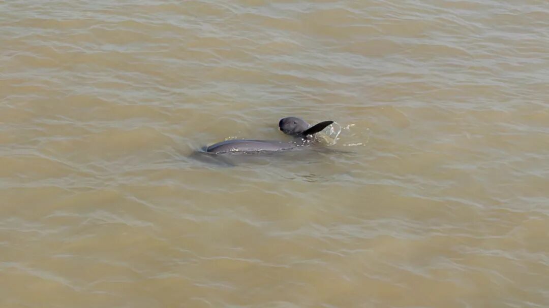 江豚“准妈妈”在江中慢悠悠地翻转着