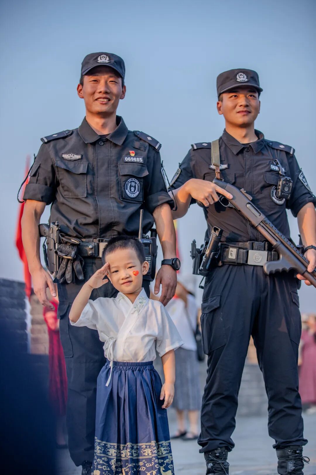 “我要和警察叔叔合影!”国庆期间,襄阳古城墙上,一位脸上贴着国旗、身着传统服饰的小朋友,与执行巡逻任务的特警队员一起留下合影。