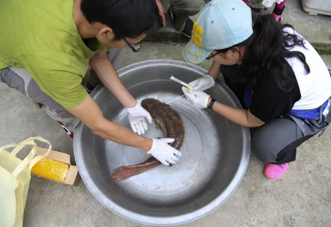 在云南昭通养殖场,科研人员对中国大鲵进行无损伤取样(2015年6月24日摄)。新华社发(陈宏满 摄)