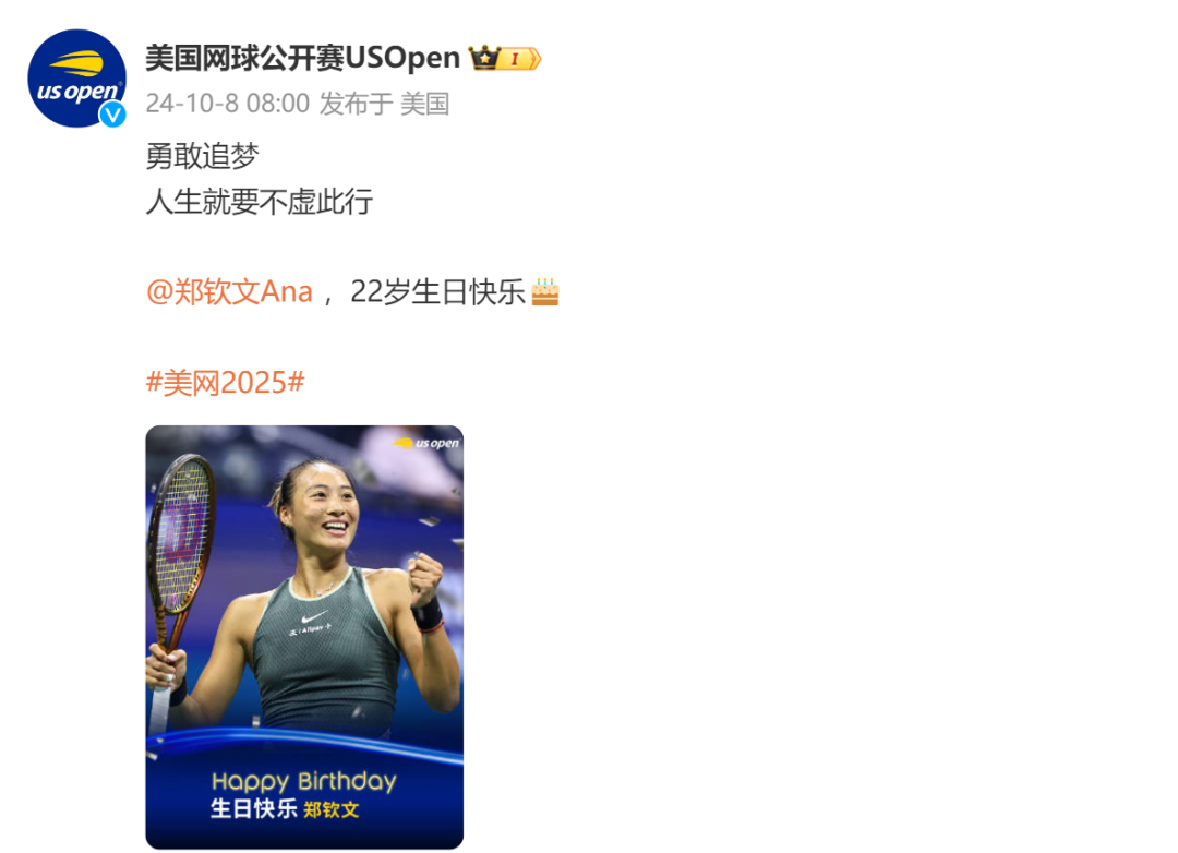 当天早上,美网、法网等也为郑钦文送上祝福。