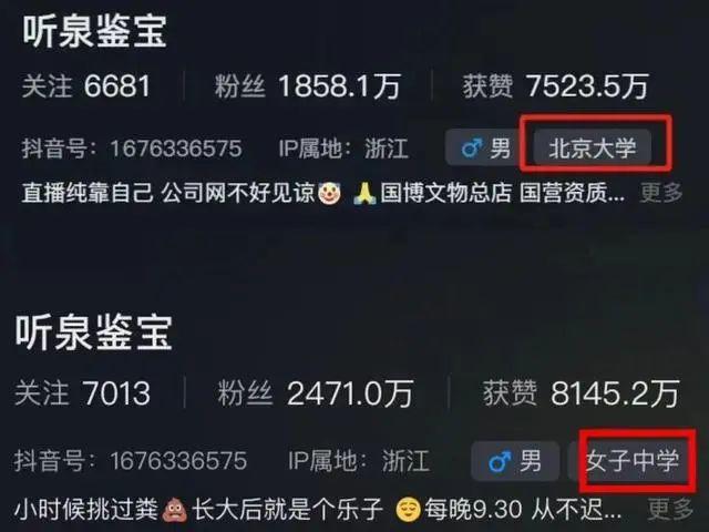 10月12日,据媒体报道,抖音账号“听泉鉴宝”的实名认证信息为丁祥栩,账号的学校信息由此前的“北京大学”改为了“女子中学”。此消息迅速引起网络热议,不少网友质疑“听泉鉴宝学历造假”。