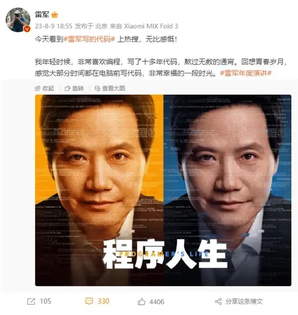 值得一提的是,雷军曾在2019年与王源的聊天中谈到了“写诗”,彼时,雷军表示:“我没有写过诗,但有人说我写过的代码,像诗一样优雅”,说完,雷军自己也笑了。