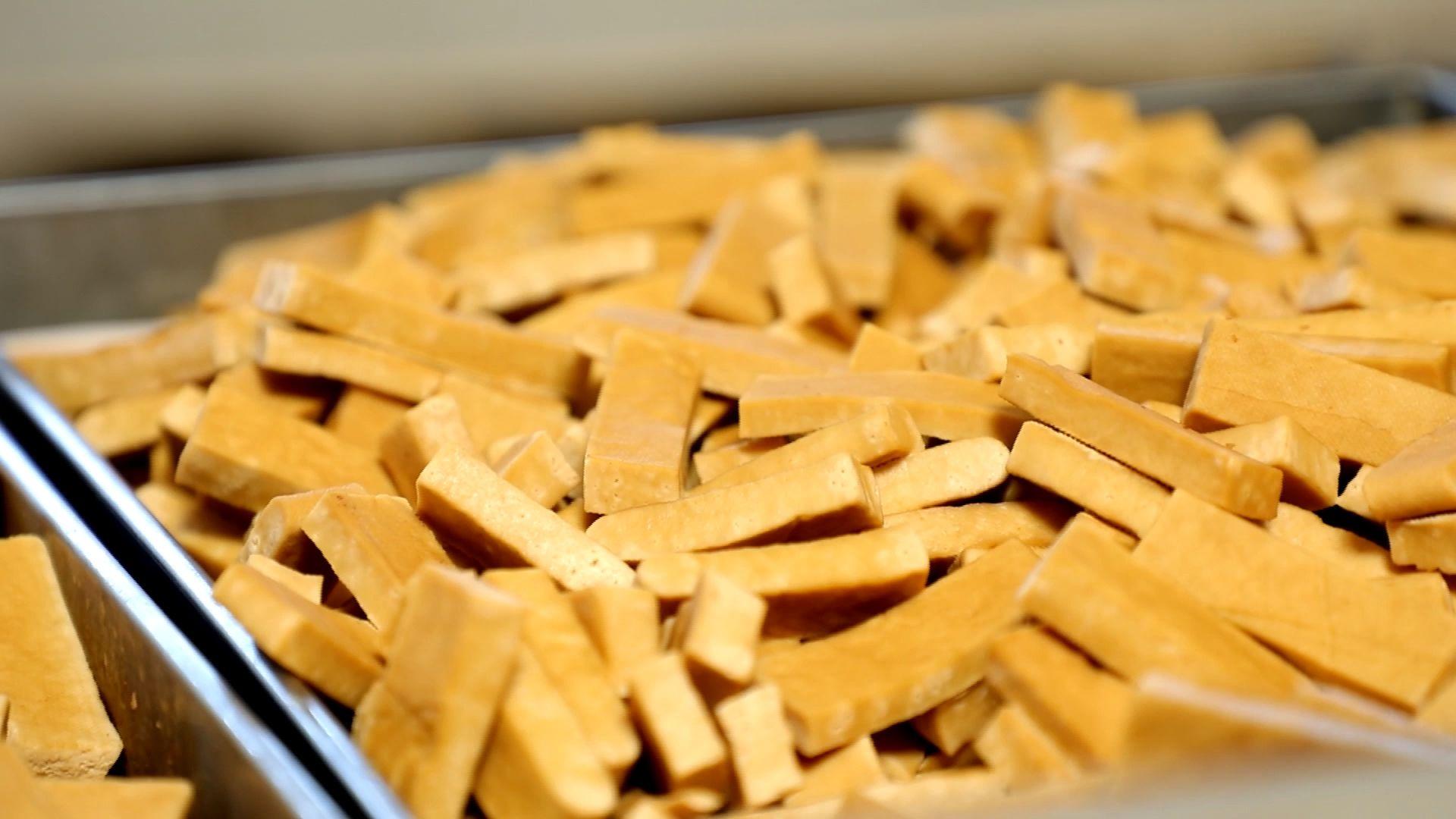 通城县麦市镇麦市豆制品厂 郑志敏:选用的材料都是本地农户种植的非转基因黄豆,我们生产豆制品有三十多道流程,我们保证了传统工艺,保证了传统的卤制方法,所以我们做出来的豆干回味、韧性都非常强,我们在保持传统和现代工艺结合的基础上,在线上线下都销得蛮好。