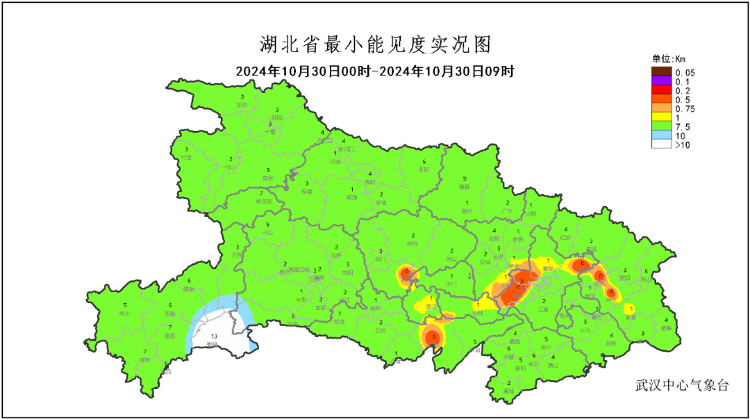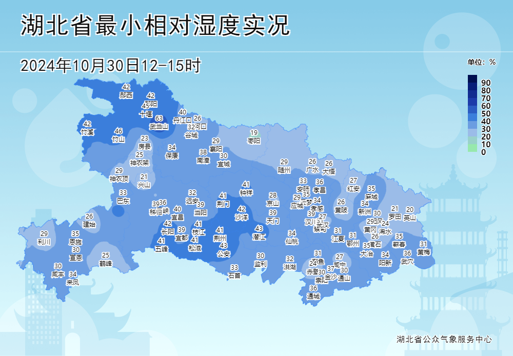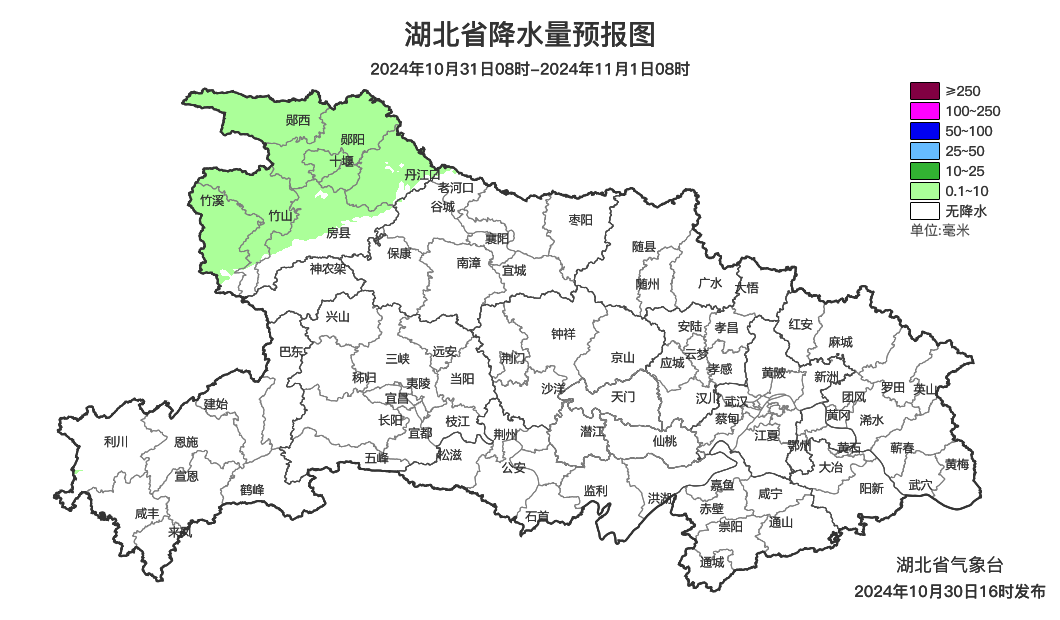 10月30日20时-10月31日08时,湖北省晴天间多云,其中十堰局地有短时小雨。最低气温11~14℃,偏北风2到3级。