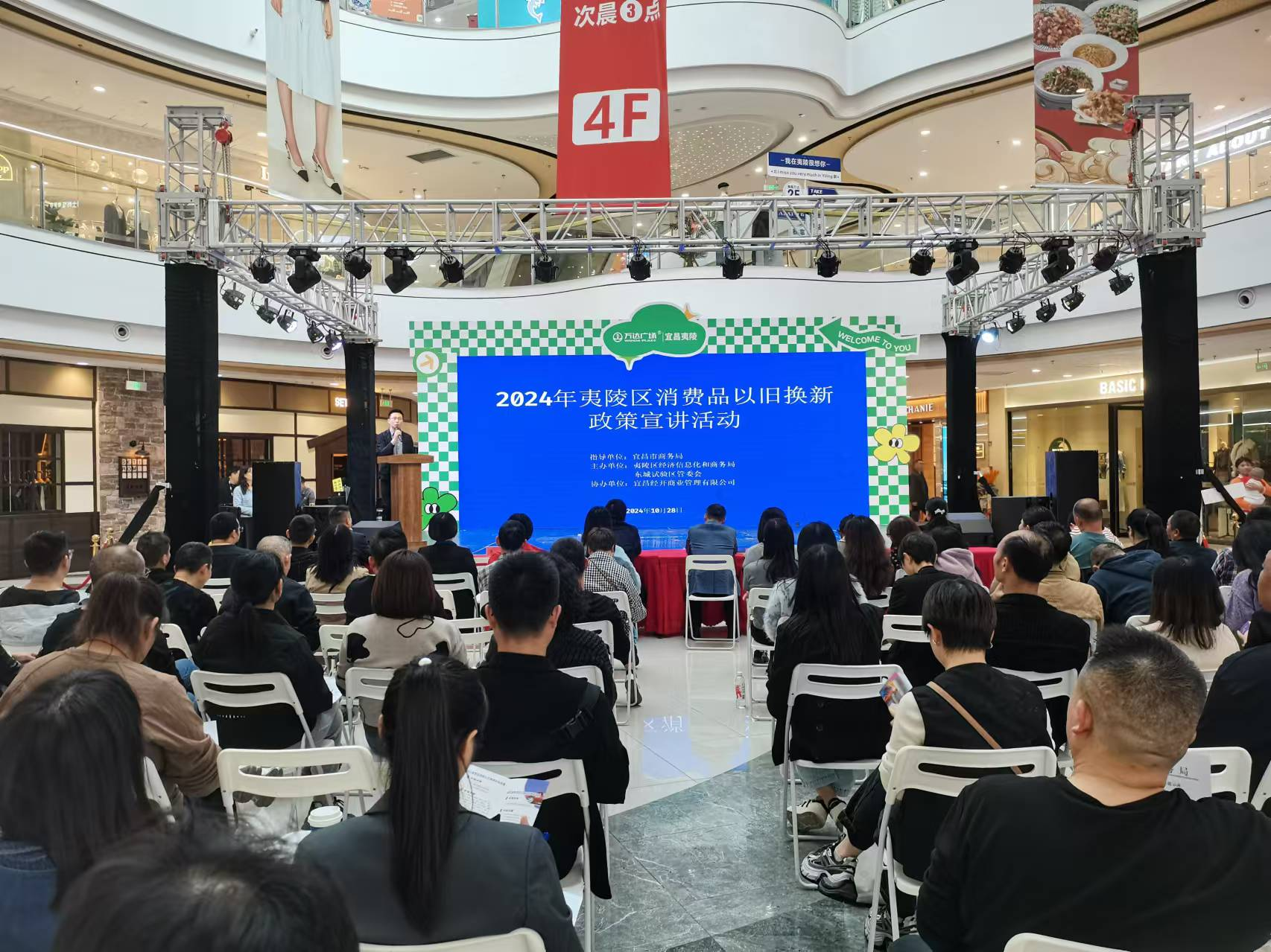 近日,夷陵区2024年消费品以旧换新政策宣讲会在夷陵万达和长江市场顺利举行,来自全区近170多家商户、行业从业者和100余名消费者参加。此次宣讲活动,旨在推动全区消费品市场更新升级,提高市民对相关政策的知晓率,促进消费市场绿色发展。