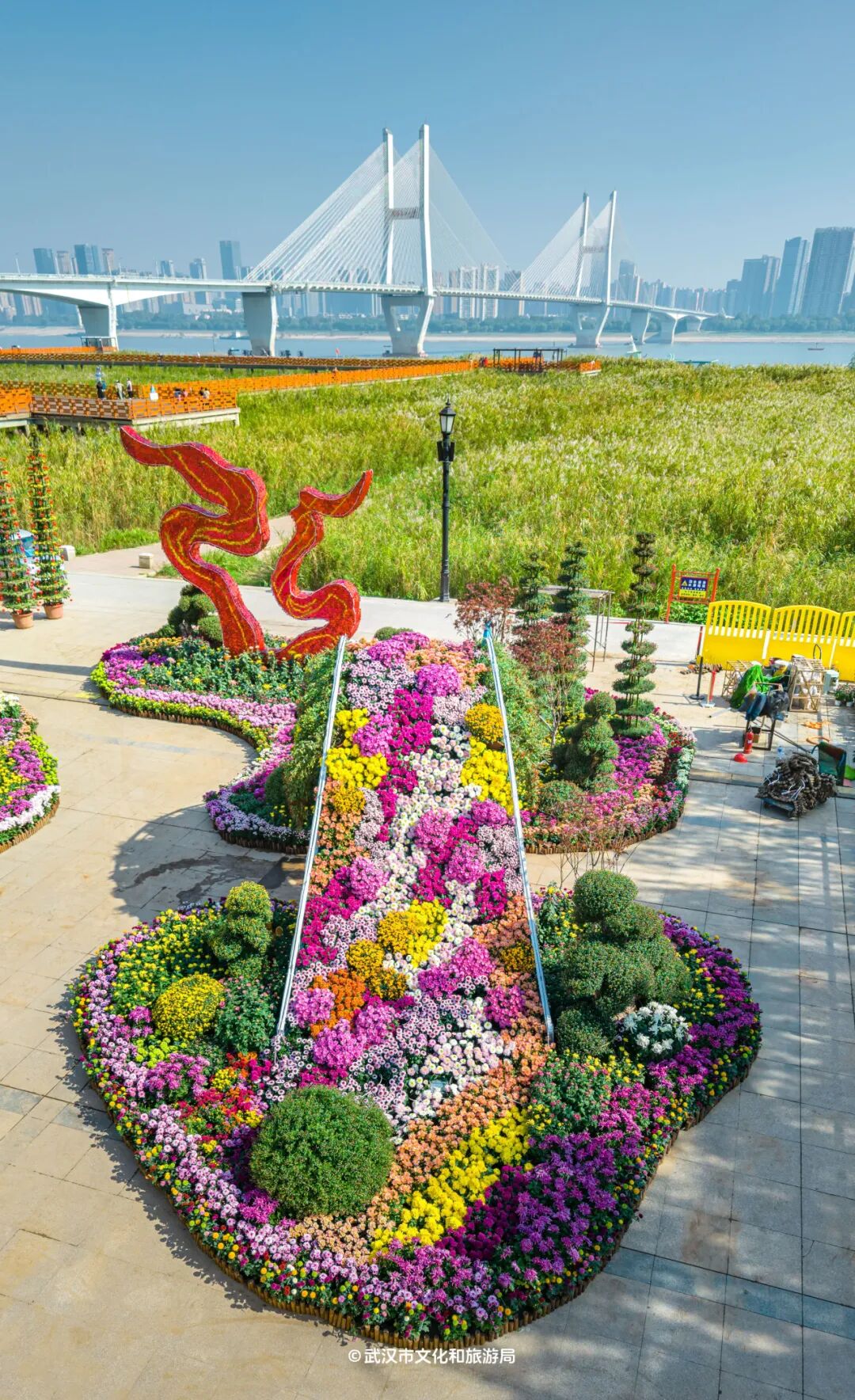 今年汉口江滩风帆广场展区达12000平方米,菊花品种1000余个,是本届菊展面积最大、品种最多的展区。