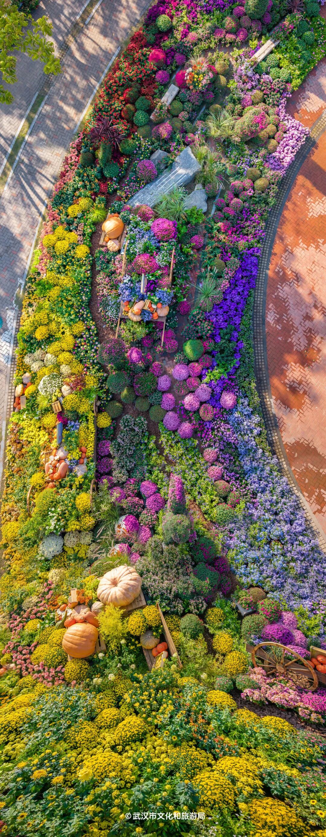 绕过南瓜花车,菊花的色调过渡到粉紫色系,浪漫而梦幻的感觉与前面完全不一样。从高空俯瞰,如一道彩虹。