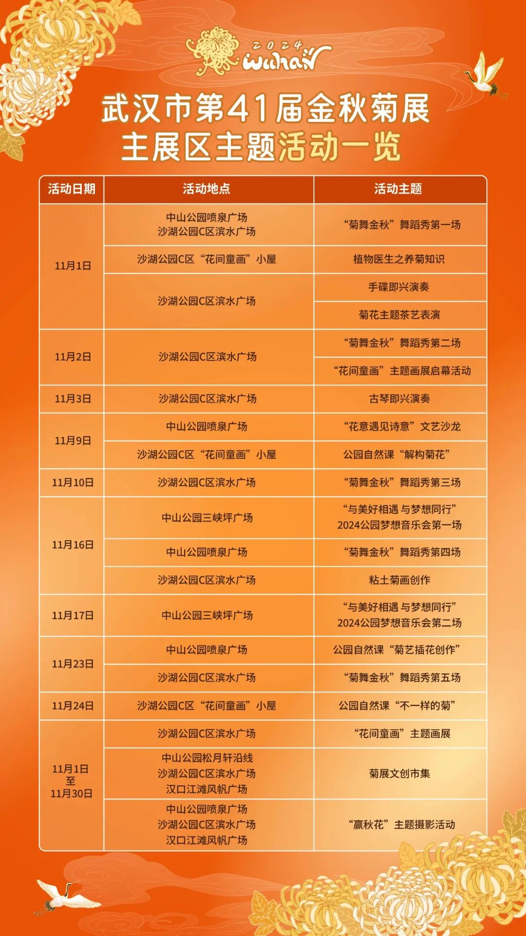 今年的菊展从11月1日展出至11月30日。全城共18个展区,其中沙湖公园、中山公园、汉口江滩为主展区。80万盆菊花、1000余个品种争奇斗艳。
