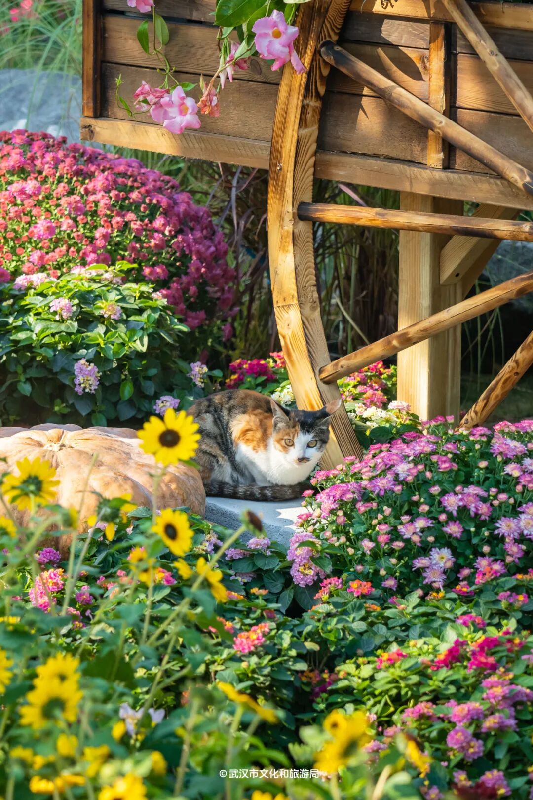 南瓜周围,黄色系的花朵铺满,上午9点或下午4点前后,暖暖的阳光下拍照会更加迷人。