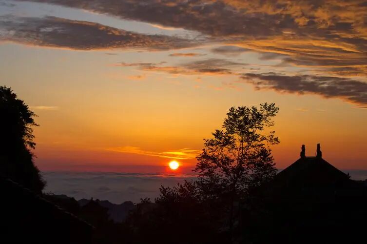 山势高峻,云雾缭绕,日出景色壮丽。天边渐明,曙光初现,云海尽头红点跃出,瞬间化为火球腾空。霞光万道,峰峦巧石渐入眼底,武当山沉浸于彩光之中,美不胜收。