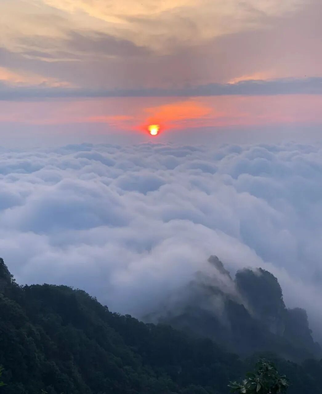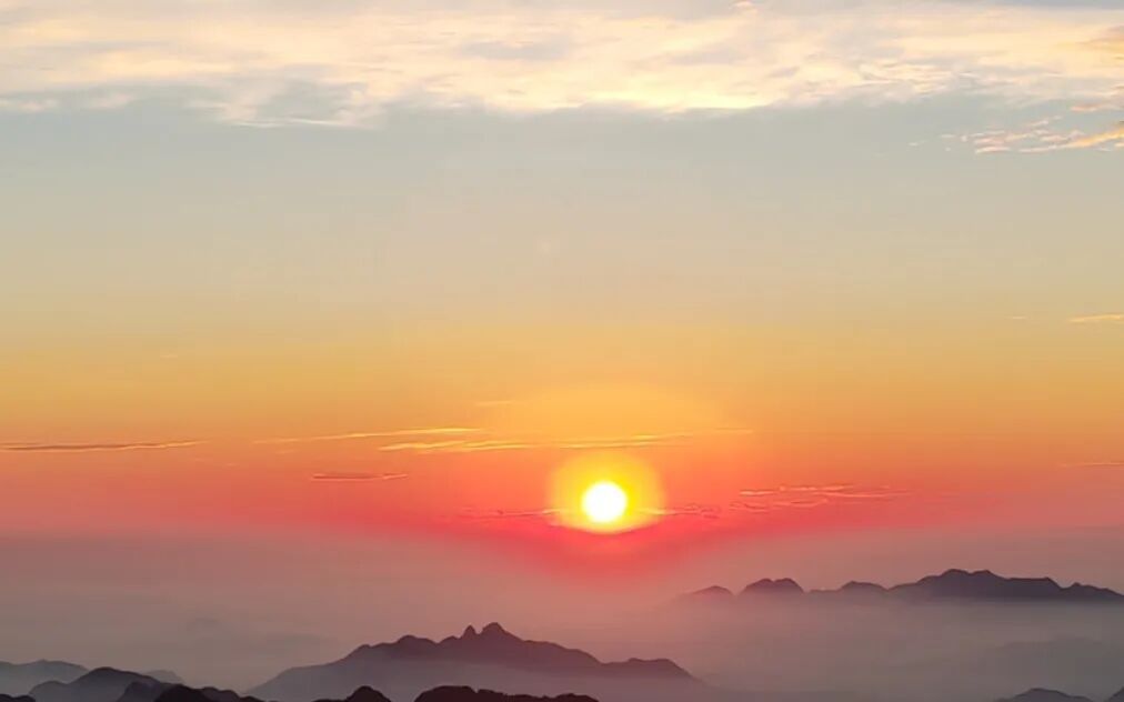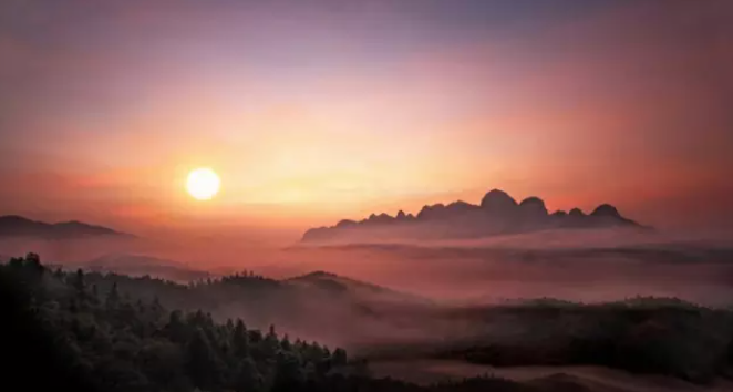 太阳升起,金色光辉如画笔,为画卷上色。金光穿透云海,将云雾染成橙黄、绯红,如梦如幻。